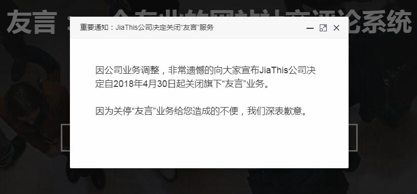繼多說后JiaThis旗下的第三方評論插件友言宣布關閉服務